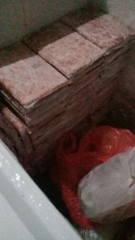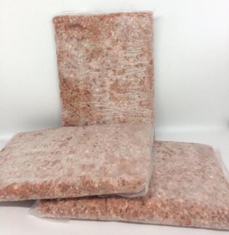 BAHAN : Dada, Punggung. Tanpa kulit. Digiling sesuai standar ransum anjing. Tersimpan sebagai stok makan beku.