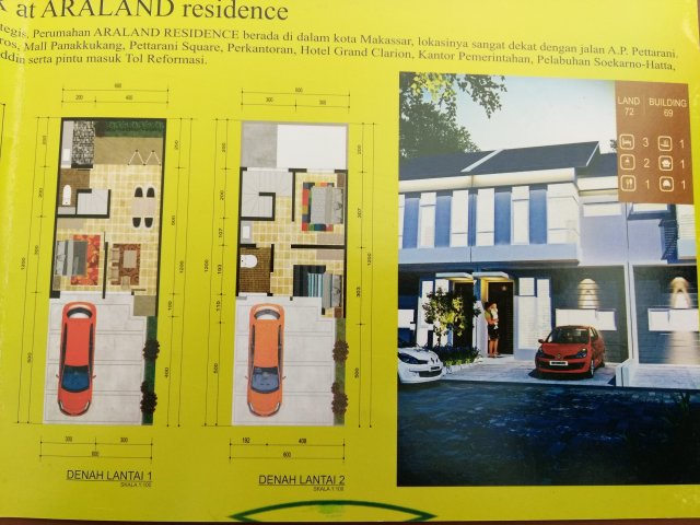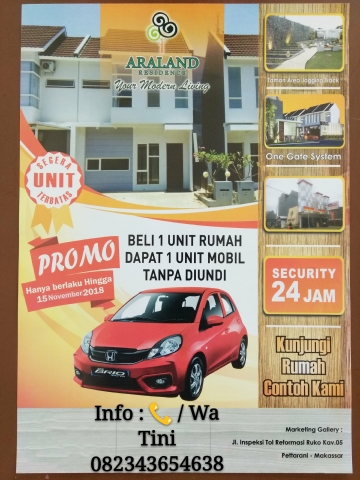 PerumahanARALAND RESIDENCE merupakanPerwujudan hunian yang bernuansa Ekslusif di TENGAH KOTA MAKASSAR, menyuguhkan hunian yang NYAMAN dan AMANdengan system CLUSTER (One Gate Sistem) serta memiliki nilai INVESTASI yang MENGUNTUNGKAN.Lokasinya sangat Strategis dekat dengan transportasi umum. Akses yang sangatMudah dan Dekat ke berbagai arah tujuan seperti : Gedung Graha Pena Fajar,Rumah Sakit Awal Bros, Mall Panakukang, Pettarani Square, Perkantoran, HotelGrand Clarion, Kantor Pemerintahan, Pelabuhan Soekarno Hatta, Bandar Udar*ltan Hasanuddin, Kampus serta Pintu M*k Tol Reformasi.