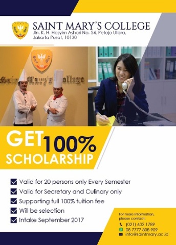 Kami juga menyediakan beasiswabagi yang berprestasi. Silahkan datang ke kampus Saint Mary's College, kamisiap membantu anda. Kampus Saint Mary's College di lengkapi dengan fasilitaslengkap guna menunjang kemajuan mahasiswa, mahasiswi dan juga di dampingi olehdosen pembimbing terampil dan profesional sehingga menciptakan lulusan SaintMary's College yang terampil, profesional dan bertaraf internasional gunamenghadapi era modern. Kami siap membantu dan menyalurkan lulusan Saint Mary'scollege mendapatkan pekerjaan yang terbaik.