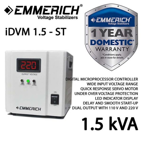 Stabilizer Listrik Emmerich iDVM 1500 VA hadir dengan teknologi servo motor, dengan teknologi servo motor yang dikontrol oleh Mikroprocesor maka respon terhadap fluktuasi tegangan input menjadi lebih cepat, iDVM 1500 VA juga dibenamkan fitur proteksi under over voltage, delay output dan auto return.