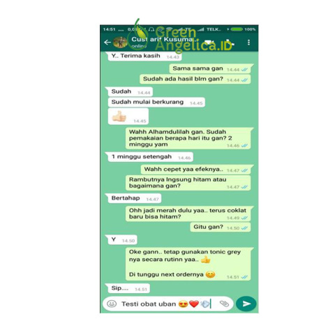 Hair Tonic Variant Grey Green Angelica menjadi satu-satunya obat penumbuh rambut yang dapat digunakan untuk menghilangkan uban di usia muda, serta mampu mengembalikan warna hitam rambut melalui perawatan secara tradisional. Obat penghitam rambut alami Green Angelica ini mengandung bahan-bahan herbal alami yang sangat baik untuk pertumbuhan serta pewarnaan rambut Anda. Bahan alami tersebut adalah Minyak Jarak atau Minyak Kastor (Castor Oil).